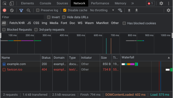 There something more simple. I went to the website example.com and this is what I see in my network tab. Focus on the chart where is has things like example.com and favicon, this is our request list, this is a list of all the requests that your browser had to make to assemble this page that you are looking at right now. Now you will want to click on the listing that says example.com