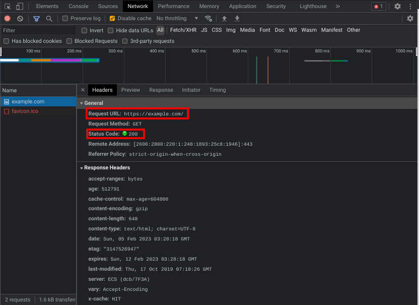 Wow look at all that useless stuff! I highlighted the only two things you need to look at and that is the Request URL and Status Code, that is pretty much all you need. Now you might be asking, well what is that red listing that says favicon? Ok, go click it, now look at the Request URL and Status code. It is requesting https://example.com/favicon.ico but the problem is, the server replied with code 404, what this means is that the server can not find this favicon.ico file, so that is why it is red. But notice how the webpage still looks fine. When game ripping, you need to make sure you ignore some of these requests. Things like the favicon are often 404 errors.
